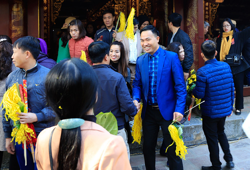 Ai nấy đều hồ hởi, phấn khởi sau khi nhận lộc hoa tre từ ban tổ chức lễ hội.