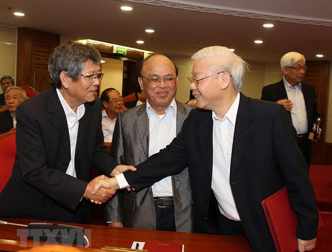Trân trọng lắng nghe, tiếp thu ý kiến, đóng góp tâm huyết, chân thành của các cán bộ nguyên là lãnh đạo cấp cao của Đảng, Nhà nước đã nêu tại Hội nghị, Tổng Bí thư, Chủ tịch nước Nguyễn Phú Trọng nêu rõ tình hình luôn luôn đổi mới, đòi hỏi phải tiếp tục đổi mới cả lý luận và thực tiễn; mong muốn các nguyên cán bộ lãnh đạo cấp cao tiếp tục đóng góp kinh nghiệm, trí tuệ, cùng Đảng, Nhà nước lãnh đạo, chỉ đạo phát triển kinh tế-xã hội đất nước, xây dựng Đảng vững mạnh.
