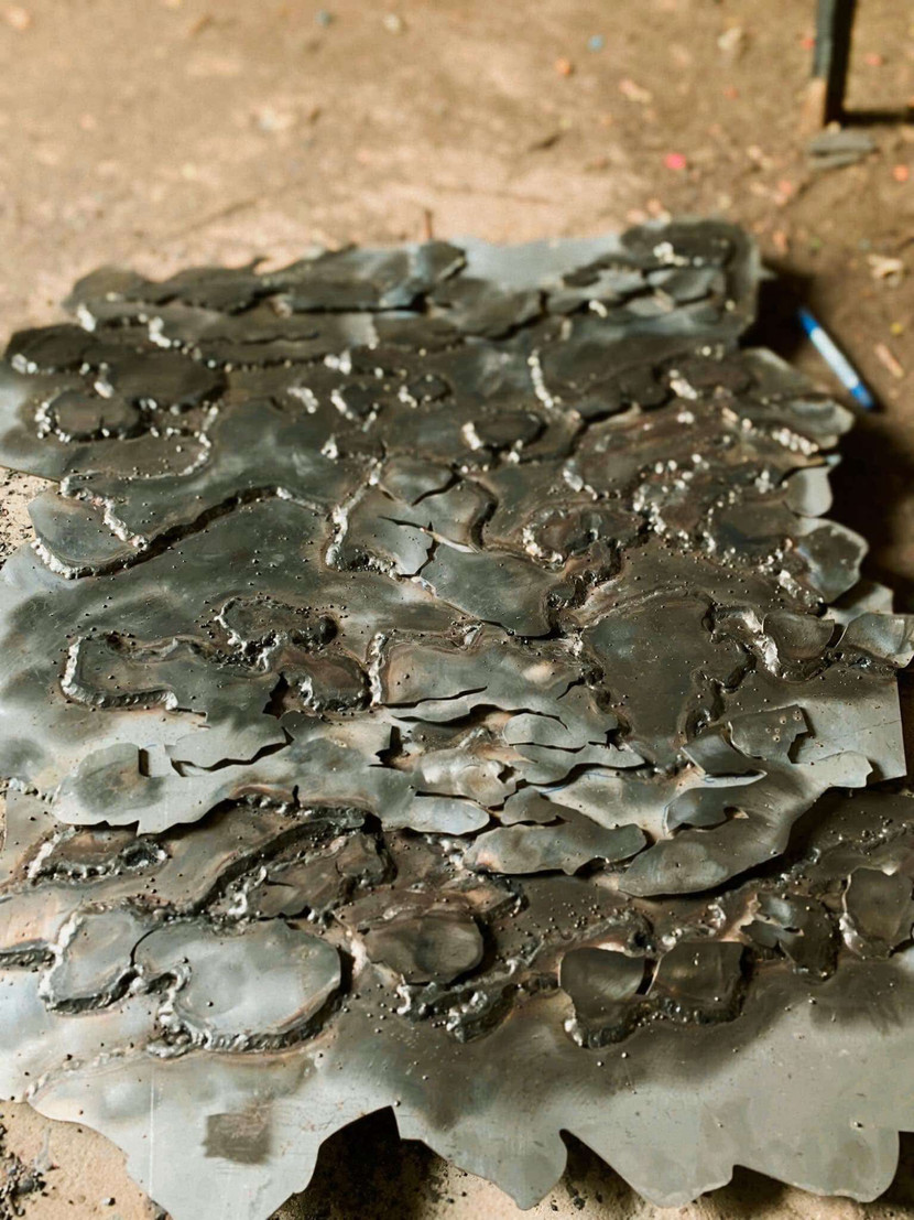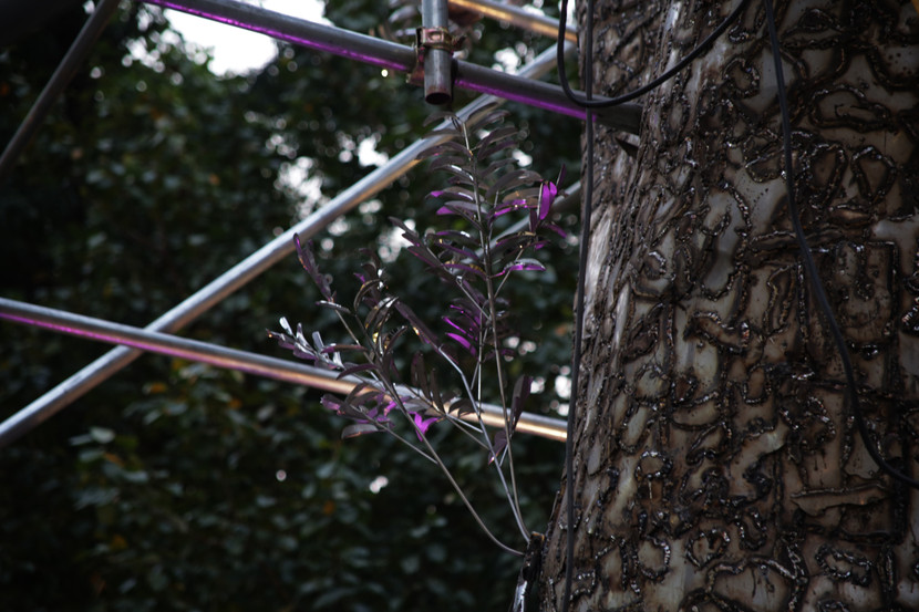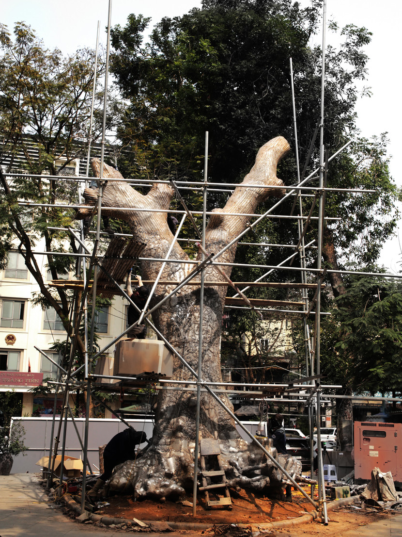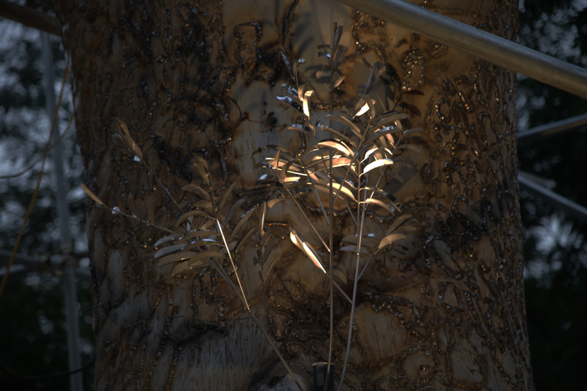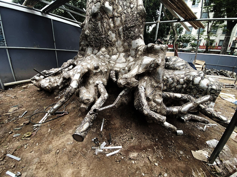 Những tấm thép dày 5mm được gò thủ công, ôm sát theo từng đường cong gồ ghề của thân cây. Các nghệ nhân hàn kín từng mối nối, tạo ra những nốt và rãnh xù xì, như thể tái hiện lớp vỏ cây trong một ngôn ngữ mới – ngôn ngữ của kim loại lấp lánh. Cành cây được mô phỏng với những đường nét khúc khuỷu, tự nhiên, trong khi tán lá được tạo nên từ hàng nghìn chiếc lá thép óng ánh, điểm xuyết bởi những “bông hoa” thạch anh lấp lánh đủ sắc màu. Khi ánh nắng lên cao, tất cả giống như được tiếp thêm sự sống để hồi sinh.