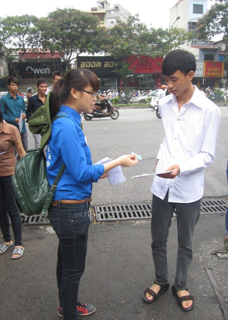 Sinh viên tình nguyện phát phiếu cơm miễn phí của chùa Hưng Khánh cho thí sinh