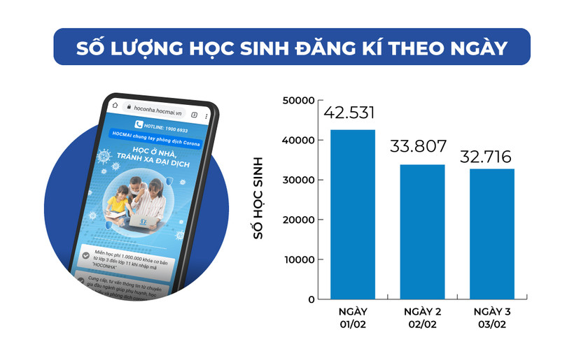 Theo thống kê của HOCMAI đơn vị cung cấp cổng học trực tuyến miễn phí hoconha.hocmai.vn, chỉ trong 3 ngày từ ngày 1 đến 3-2 ,đã có tới hơn 100.000 học sinh đăng kí các khóa học trực tuyến với gần 330.000 khóa học được kích hoạt thành công.