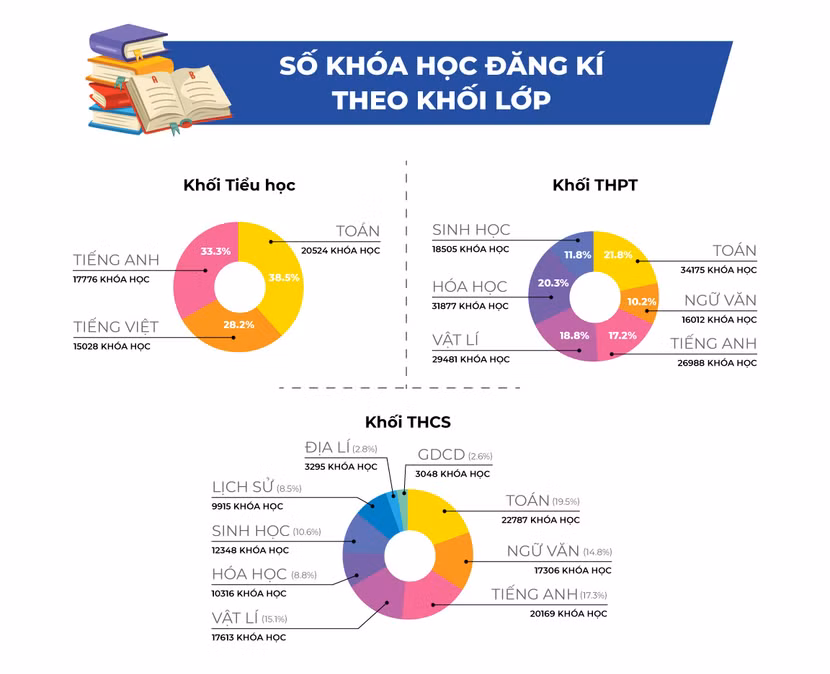 Theo đó, riêng số lượng học sinh lớp 10, 11 thuộc khối THPT đăng kí khóa học chiếm đến hơn 48%, khối THCS chiếm gần 36%. Đáng chú ý, số lượng học sinh lớp 9 đăng kí học lên tới hơn 14.000 học sinh, chiếm hơn 23% tổng số học sinh đăng kí.
