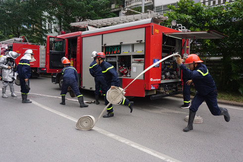 Sau ít phút, lực lượng PCCC chuyên nghiệp bao gồm 11 xe, trong đó có 2 xe chỉ huy, 1 xe thang, 2 xe cứu hộ, 5 xe chữa cháy, 1 xe cứu thương và 70 chiến sĩ của các đơn vị thuộc Cảnh sát PCCC thành phố Hà Nội nhanh chóng có mặt tại hiện trường làm nhiệm vụ.