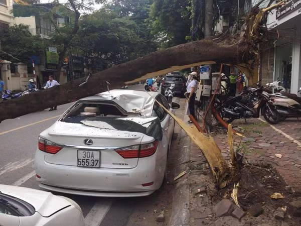 Trước đó, vào 14h chiều 4-6, chiếc ô tô hiệu Lexus ES300H đang đỗ ven đường Tô Hiến Thành (phường Lê Đại Hành, Hoàn Kiếm, Hà Nội) thì bất ngờ bị một cây phượng lớn đổ đè lên. Sự việc xảy ra khiến chiếc ô tô hiệu Lexus bị bẹp dúm.