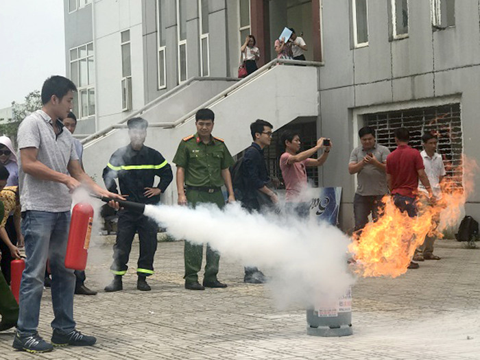 Sau phần phổ biến kiến thức, các cán bộ, giáo viên đã được thực hành cách sử dụng các phương tiện bình bột, bình CO2 để dập tắt đám cháy và cách thức xử lý nhanh các tình huống có thể xảy ra.
