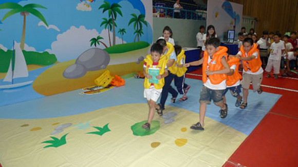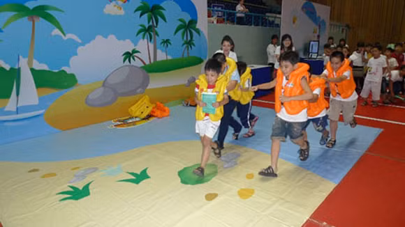 Học sinh chơi trò “Vượt sông an toàn” trong Ngày hội