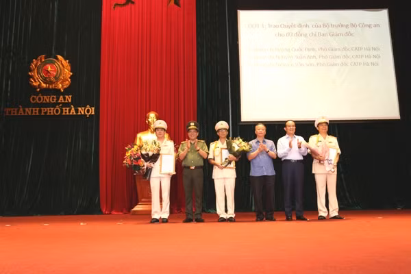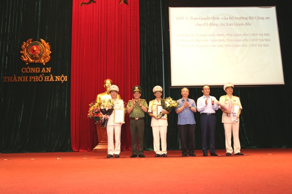 Các đồng chí Nguyễn Ngọc Tuấn, Phó Chủ tịch Thường trực HĐND TP; Nguyễn Văn Sửu, Phó Chủ tịch Thường trực UBND TP và Thiếu tướng Đoàn Duy Khương, Giám đốc CATP Hà Nội tặng hoa, chúc mừng các đồng chí Phó Giám đốc CATP vừa được điều động, bổ nhiệm