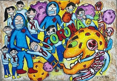 Bức tranh “Cuộc chiến chống Corona-Covid-19” của Nguyễn Đăng Tiền Phong, học lớp 6, trường THCS Trần Cao Vân – Huế. Nguồn: Facebook Hồ Đăng Thanh Ngọc.