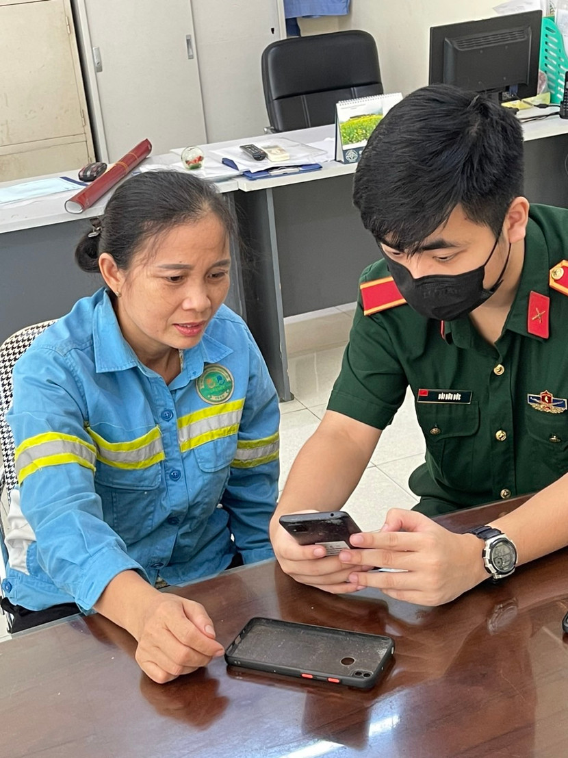 | Những công nhân vệ sinh môi trường được lực lượng Công an hỗ trợ sử dụng ứng dụng VNeID và xác thực mã định danh cá nhân |
