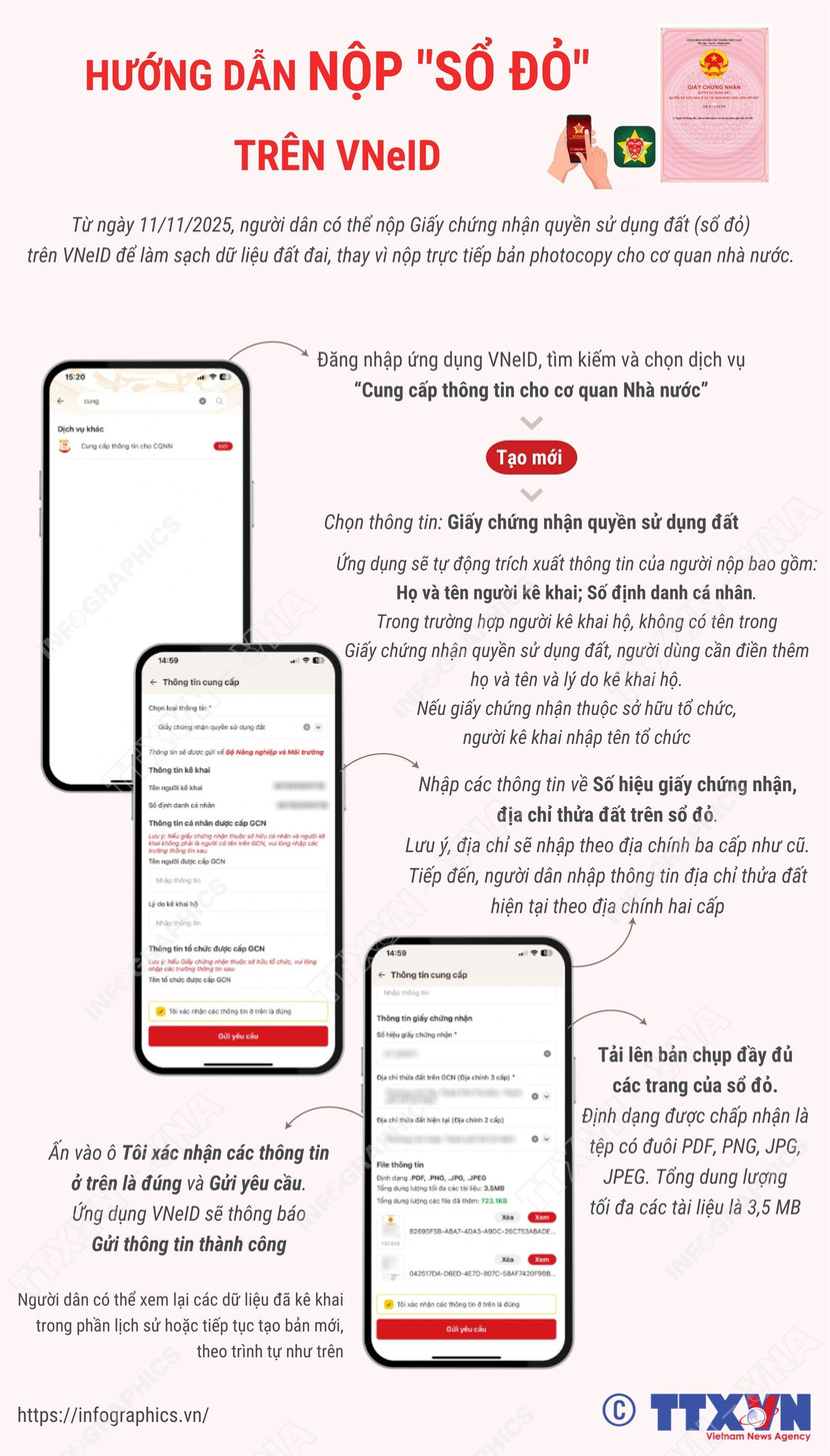 ANTD.VN - Từ ngày 11/11/2025, người dân có thể nộp Giấy chứng nhận quyền sử dụng đất (sổ đỏ) trên VNeID để làm sạch dữ liệu đất đai, thay vì nộp trực tiếp bản photocopy cho cơ quan nhà nước.