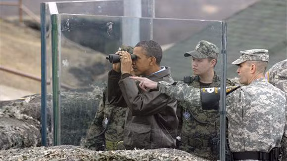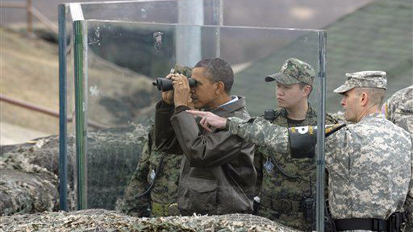 Sáng 25-3, sau khi tới Seoul, hoạt động đầu tiên của Tổng thống Mỹ Barack Obama là tới thăm khu phi quân sự ở biên giới 2 miền Triều Tiên. Ông Obama đã có cuộc gặp với các binh sĩ tại trại Bonifas ở gần khu vực biên giới. Tại điểm quan sát giữa 2 miền Triều Tiên, ông Obama đã dành khoảng 10 phút, sử dụng ống nhòm nhìn sang bên kia biên giới (đứng sau 1 tấm kính chống đạn). Chuyến thăm của Tổng thống Obama diễn ra trong bối cảnh căng thẳng leo thang và người đứng đầu Nhà Trắng đang cân nhắc các biện pháp đáp trả kế hoạch phóng tên lửa mang theo vệ tinh của Triều Tiên.