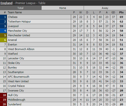 Bảng xếp hạng tạm thời tính tới ngày 5-4-2017