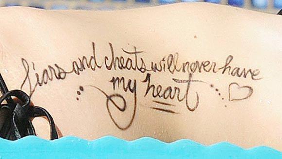Tung tăng tắm nắng trong bể bơi tại khách sạn ở Los Angeles hôm 29-6, Hoa hậu xứ Wales 2003, Imogen Thomas gây chú ý với dòng chữ nổi bật ở sườn trái được cho là thông điệp đẩy ẩn ý gửi tới ngôi sao kỳ cựu của MU. Dòng chữ được dịch ra là "Những kẻ dối trá và lừa tình không bao giờ có chỗ trong trái tim tôi".