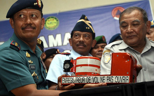 Giới chức công bố thiết bị ghi âm buồng lái của máy bay hãng AirAsia tại Pangkalan Bun, Borneo, Indonesia.
