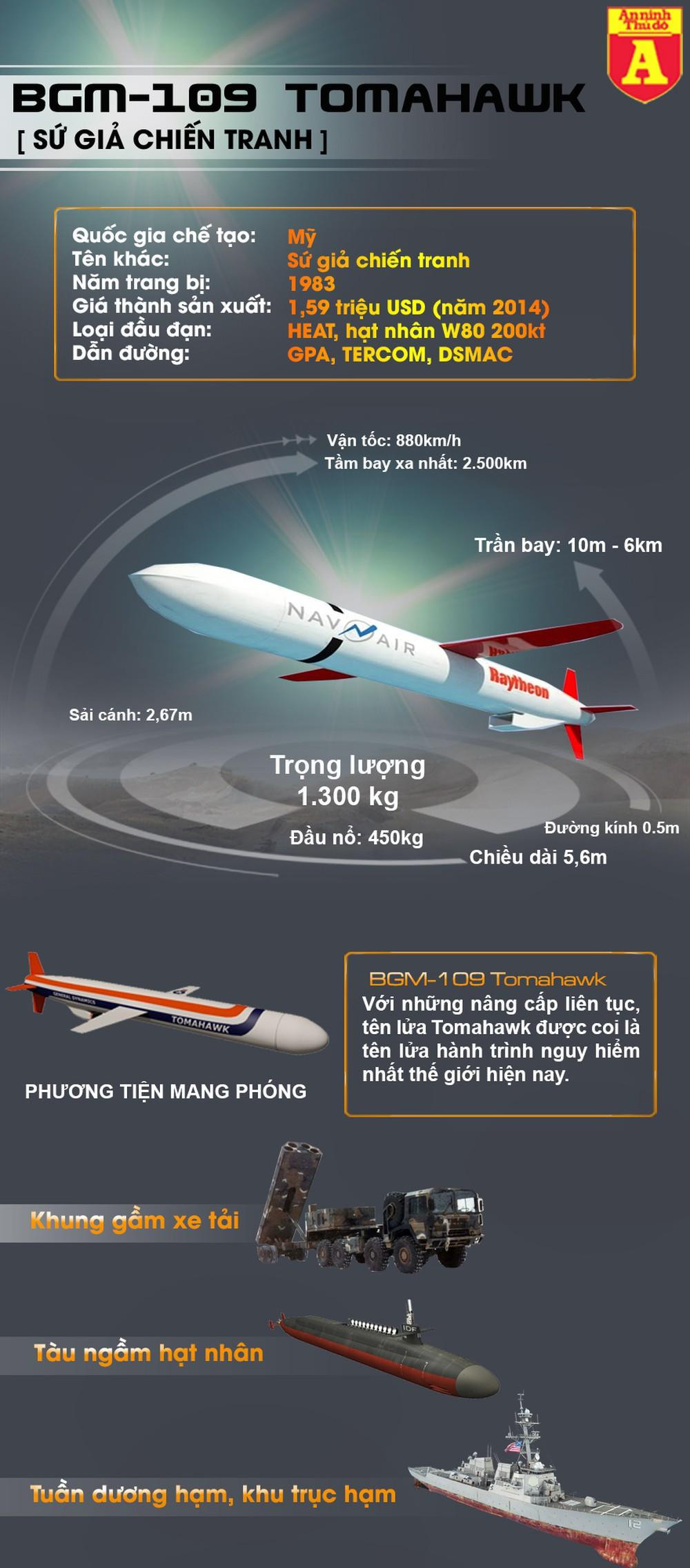 Các chuyên gia quân sự đánh giá tên lửa Tomahawk là thứ vũ khí cách mạng tạo ra bước ngoặt thay đổi quy luật tác chiến của hải quân Mỹ. BGM-109 Тomahawk là tên lửa hành trình có cánh được phóng từ các phương tiện trên biển, trên không và trên mặt đất. Tên lửa được thiết kế theo mẫu máy bay cánh đơn – thân tên lửa là ống trụ tròn, hai cánh chính có thể gấp lại và được lắp ở trọng tâm tên lửa và bốn cánh ổn định đuôi hình chữ thập.