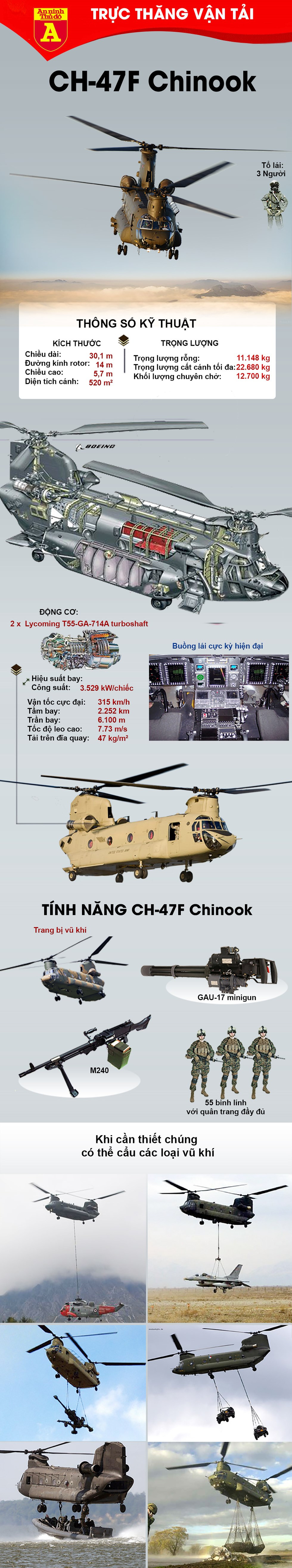 CH-47 Chinook là một trong những trực thăng vận tải lớn nhất trên thế giới do hãng Boeing Rotocraft System phát triển từ những năm 1960, sản xuất từ năm 1962 tới tận ngày nay, là một trong những loại trực thăng thành công nhất, phục vụ rộng rãi ở hàng chục quốc gia trên thế giới. Ngoài khả năng mang những hàng hoá “khủng” trong khoang như lựu pháo, CH-47 còn có khả năng cẩu hàng cồng kềnh tới chiến trường. Trong các cuộc chiến tranh, không quân Mỹ thường xuyên dùng CH-47 để không vận vũ khí hạng nặng tới các khu vực hiểm trở.