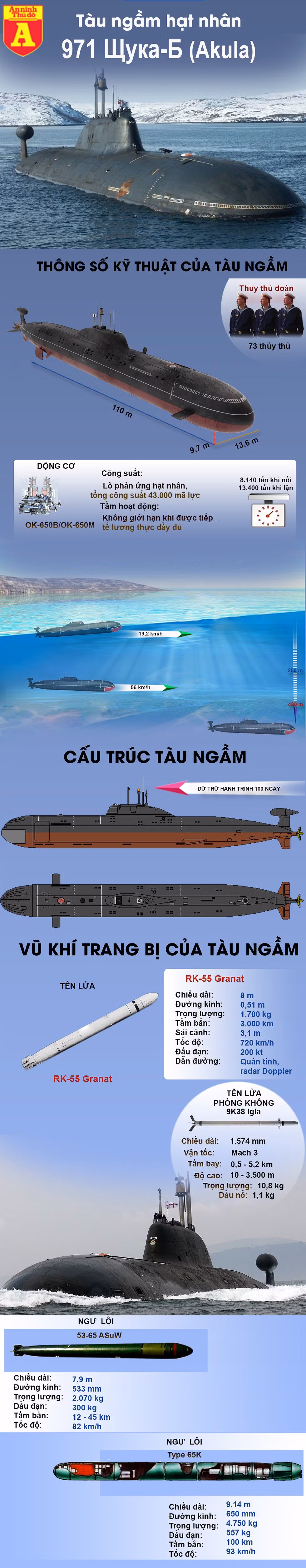 Cùng xem thông số của loại tàu ngầm chiến lược này qua infographic dưới đây.