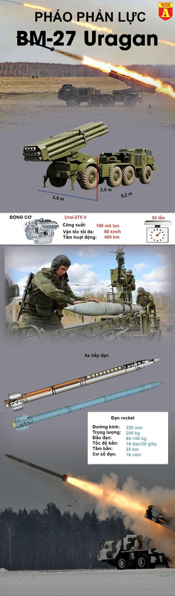 BM-27 Uragan có thể bắn nhiều loại đạn gồm: đạn huấn luyện, đạn nổ phá mảnh, đạn hóa học, đạt nhiệt áp, đạn chùm với chức năng chống tăng và chống bộ binh. Trong nhiệm vụ chống bộ binh, mỗi quả đạn 220mm có thể rải 312 mìn chống bộ binh PFM-1. BM-27 Uragan đạt tầm phóng tối đa 35km, phóng hết cơ số đạn trong vòng 20 giây phủ lên diện tích khoảng 4,3 ha.