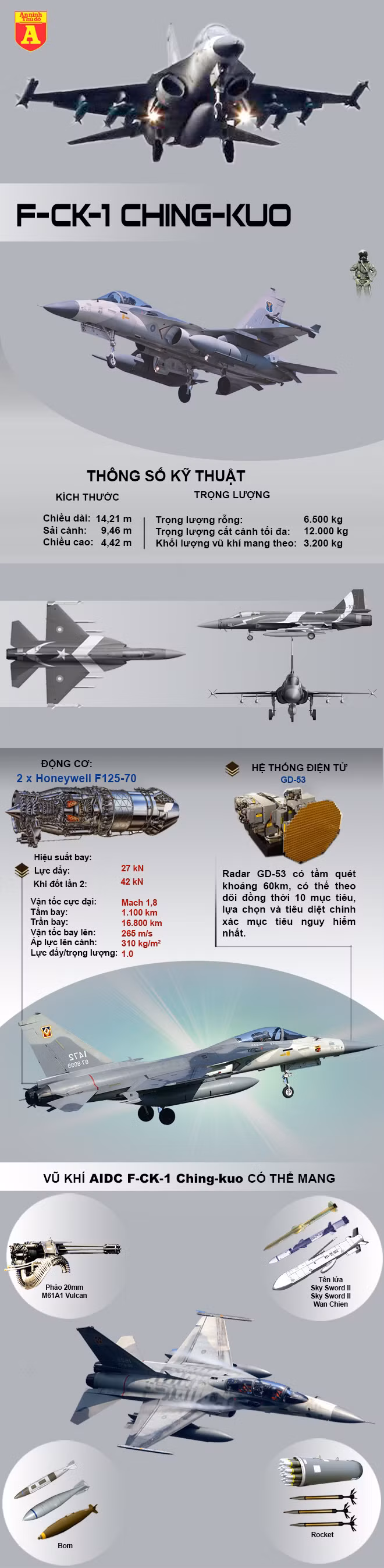 Ít ai biết rằng, dù chỉ là một đảo quốc bé nhỏ, nhưn Đài Loan (TQ) lại có thể chế tạo được cả chiến đấu cơ, đó chính là tiêm kích đa năng F-CK-1. Loại máy bay này được phát triển dựa trên nền tảng của loại chiến đấu cơ F-16 của Mỹ. Tính tới thời điểm hiện tại đã có 131 chiếc được sản xuất kể từ khi chính thức được nhận vào biên chế trong không quân Đài Loan vào năm 1994.