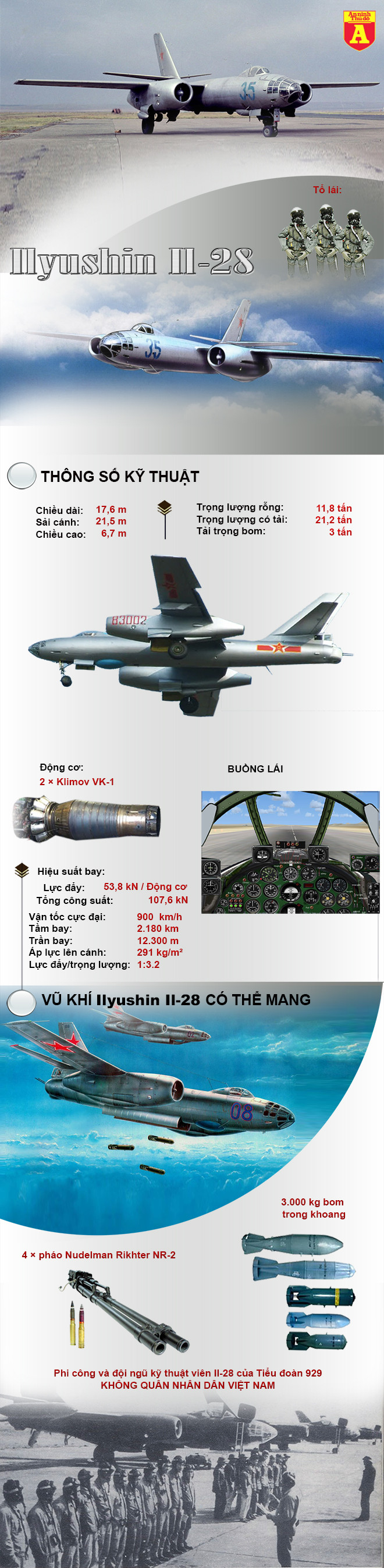 Không quân Nhân dân Việt Nam đã tiếp nhận 8 chiếc máy bay Il-28 do Liên Xô viện trợ vào tháng 6/1965. Trong đó có 4 chiếc chiến đấu (số hiệu 2082, 2084, 2086, 2088), 3 chiếc trinh sát chụp ảnh (2182, 2184, 2186) và 1 chiếc huấn luyện (2180). Tất cả số máy bay ném bom Il-28 của Việt Nam đều được biên chế vào đơn vị không quân có phiên hiệu T-16 thuộc Tiểu đoàn độc lập 929.