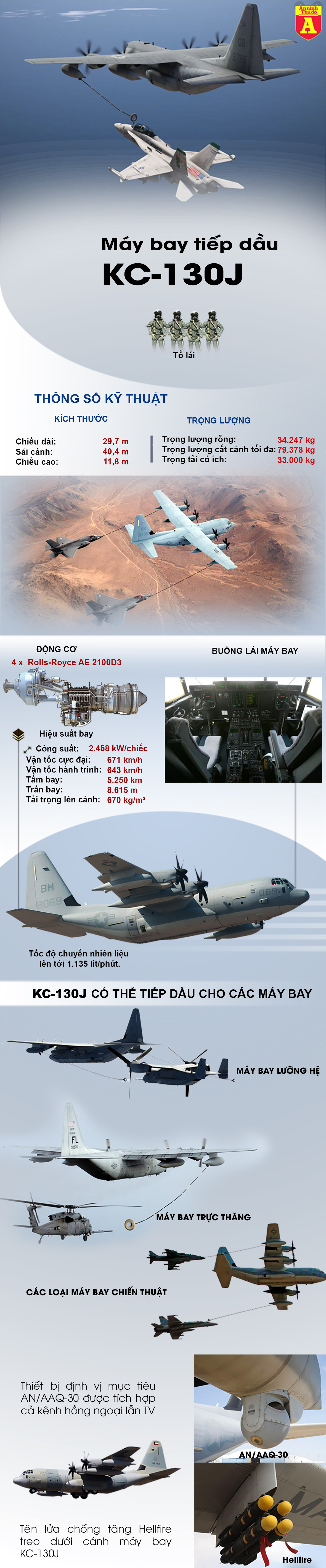 Được cải tiến dựa trên khung máy bay C-130, máy bay tiếp dầu KC-130J có thể mang được hơn 45 tấn nhiên liệu. Chủ yếu được lực lượng Hải quân đánh bộ Mỹ sử dụng, KC-130 có khả năng tiếp nhiên liệu đồng thời cho 2 máy bay trên không. Máy bay tiếp dầu sẽ giúp tăng tầm không chiến cho các máy bay chiến đấu.