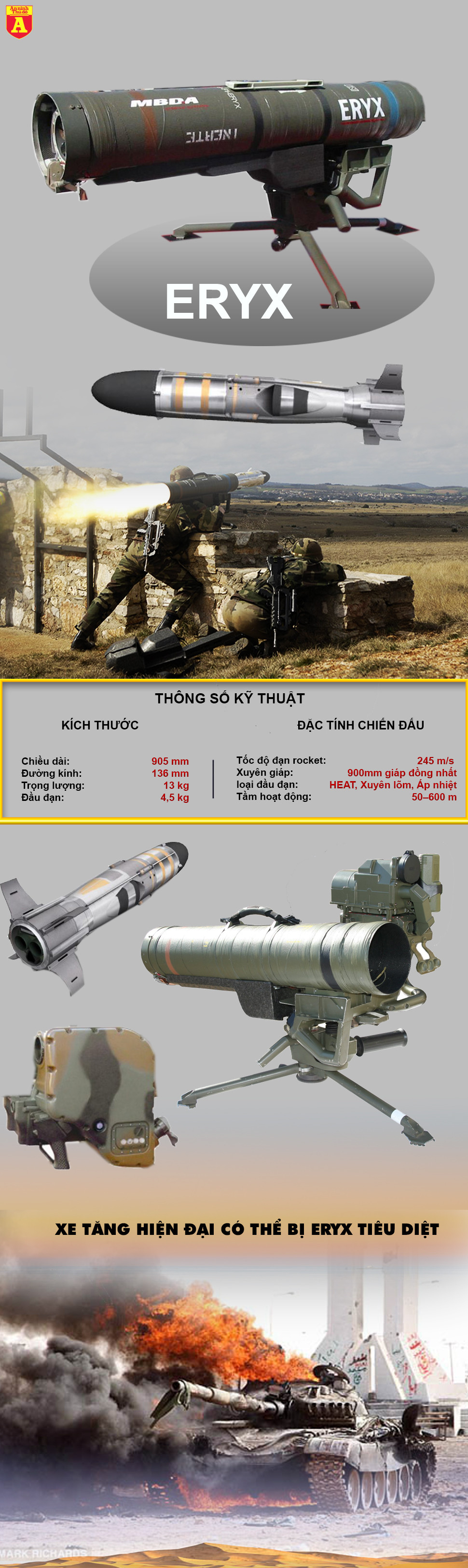 Được biết, Eryx là sản phẩm của công ty Aerospatiale (Pháp), được đánh giá là loại vũ khí chống tăng hiệu quả, có thể thực hiện được loạt nhiệm vụ khác nhau từ tấn công lực lượng tăng thiết giáp, tàu chiến cỡ nhỏ đến cả trực thăng bay thấp.