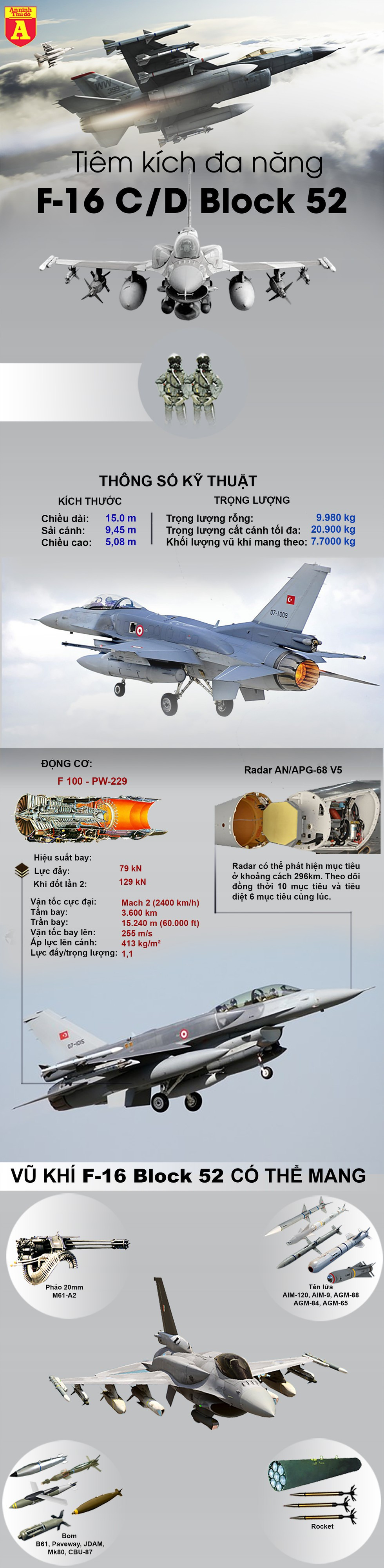Thổ Nhĩ Kỳ là một trong số ít quốc gia sở hữu số lượng lớn tiêm kích F-16. Hiện họ đang có trong tay khoảng 240 chiếc, đa phần là phiên bản F-16C/D Block 52. Đây được coi là loại chiến đấu cơ xương sống của không quân nước này và chúng cũng chính là thủ phạm bắn rơi Su-24 trên bầu trời Syria năm 2015.