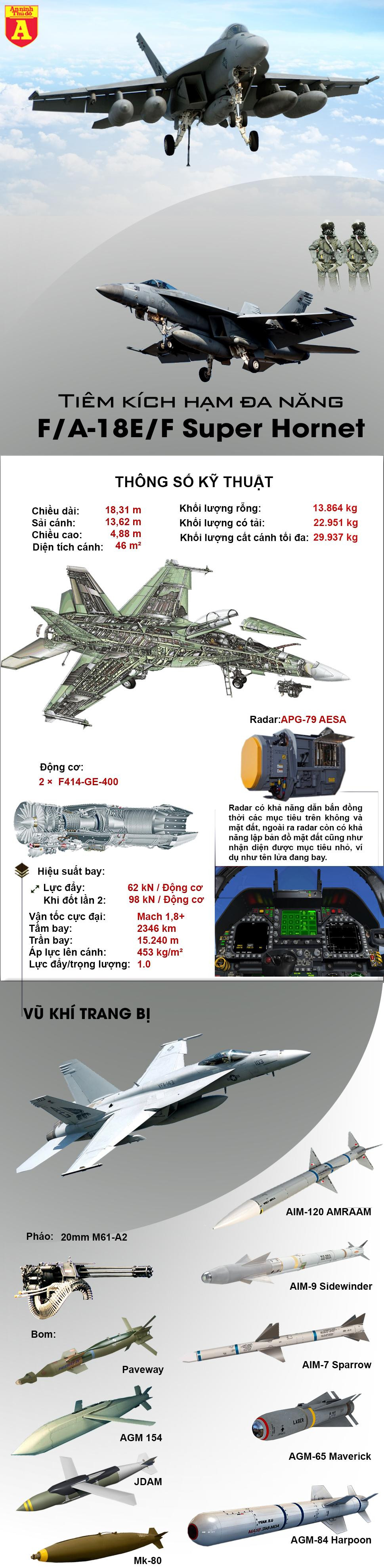 Mang tải trọng bom đạn lớn, tầm bay xa, hệ thống điện tử hiện đại cùng khả năng cơ động cao, F/A-18E/F Super Hornet là nỗi khiếp sợ cho bất kỳ cánh quân nào là mục tiêu của nó. Cùng xem thông số chi tiết loại tiêm kích hạm hạng nặng này qua infographic dưới đây.