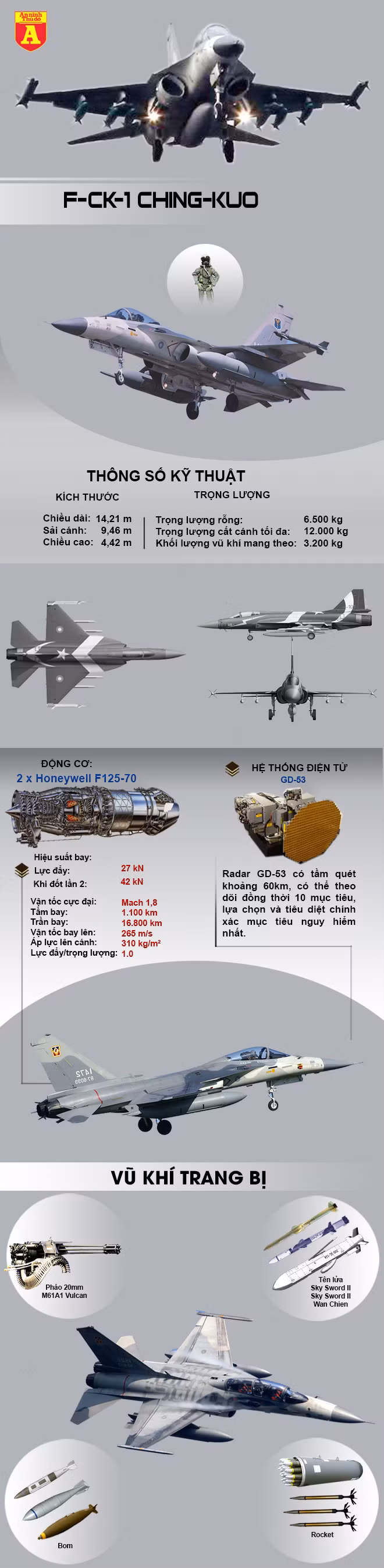 F-CK-1 Ching-kuo là chiến đấu cơ hạng nhẹ đa nhiệm có thể hoạt động trong mọi điều kiện thời tiết do vùng lãnh thổ Đài Loan nghiên cứu chế tạo với sự giúp sức của Mỹ. Chúng được phát triển dựa trên nền tảng của loại chiến đấu cơ F-16 của Mỹ, tính tới thời điểm hiện tại đã có 131 chiếc được sản xuất kể từ khi chính thức được nhận vào biên chế trong không quân Đài Loan vào năm 1994.