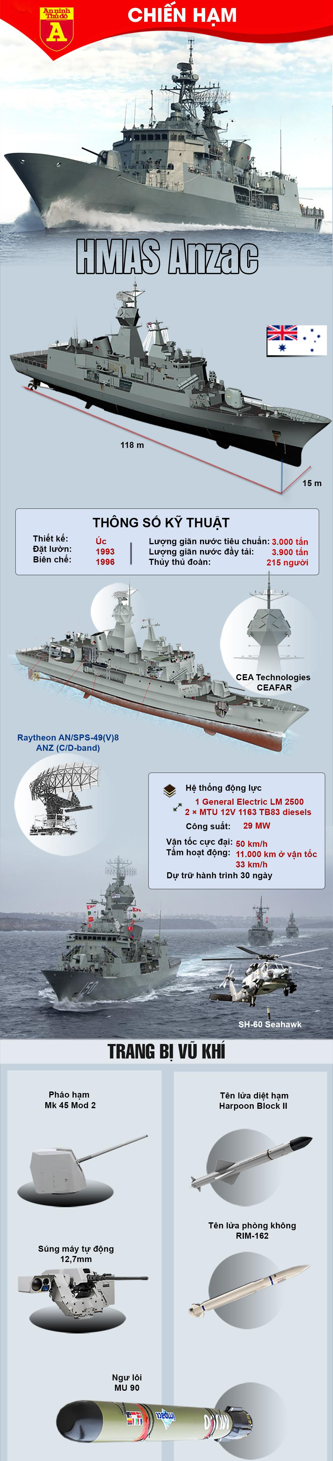 Chiến hạm HMAS Anzac là một trong những chiến hạm mạnh mẽ trong biên chế hải quân Australia và là chiếc đầu tiên trong số 8 chiếc của lớp tàu hộ vệ tên lửa Anzac trong biên chế hải quân Australia. Tàu được trang bị kho vũ khí mạnh mẽ để có thể tấn công phòng thủ một cách toàn diện.