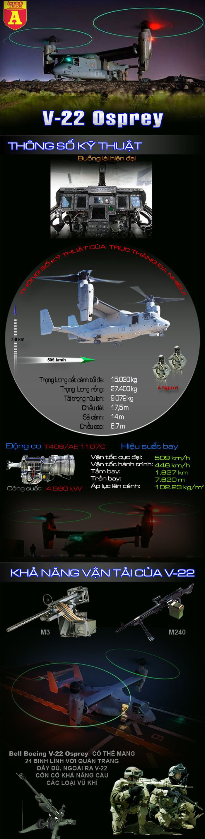 Nhờ trang bị 2 động cơ АЕ1107С Liberty có tổng công suất 6.150 mã lực, V-22 có khả năng đạt tốc độ bay tối đa tới 510 km/giờ ở chế độ máy bay, 184 km/giờ ở chế độ trực thăng, và có thể bay lên tới độ cao 7,5 km. Làm nhiệm vụ vận tải nên chúng chỉ được trang bị nhẹ bao gồm các súng máy cỡ nòng 12,7mm và 7,62mm.