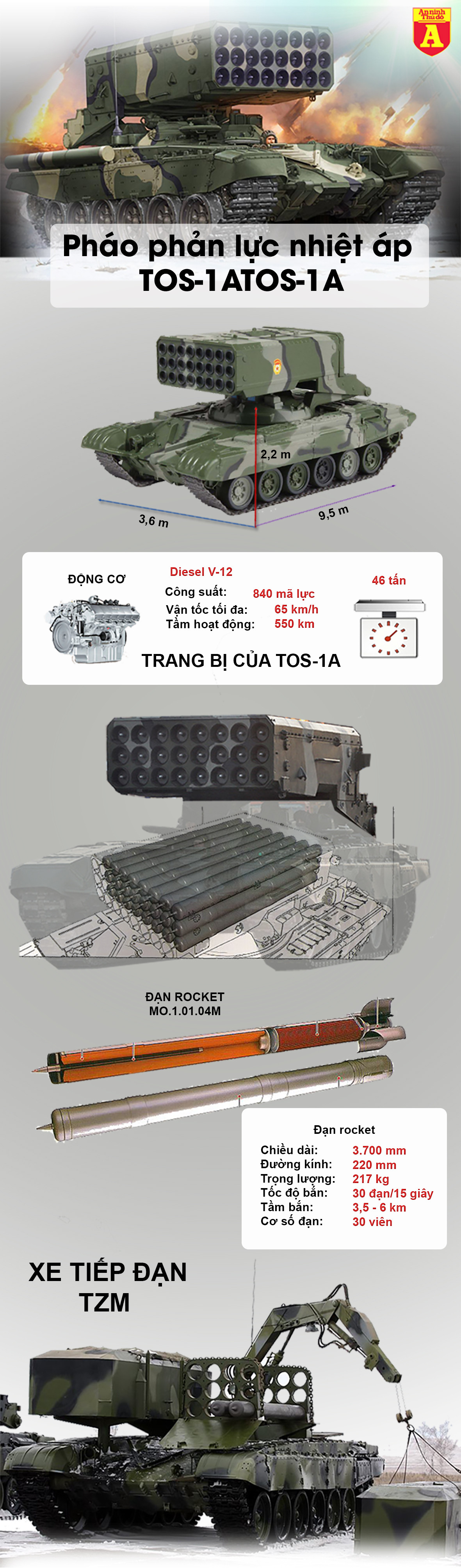 Nguồn tin này cho biết, Nga trang bị TOS-1A cho lực lượng Lục quân SAA nhằm lấp đầy lỗ hổng chết người của lực lượng này trong quá trình chiến đấu với phiến quân, nhất là chiến trường Đông Bắc Syria trong thời gian qua. TOS-1A là hệ thống phóng rocket và phóng đạn nhiệt áp 24 nòng cỡ 220mm đặt trên phần khung thường được sử dụng cho chiến tăng chủ lực T-72.TOS-1A có khả năng phóng đạn nhiệt áp tạo thành “đám mây” dung dịch gây cháy bao quanh mục tiêu và kích hoạt dung dịch này tạo thành một vụ nổ lớn.