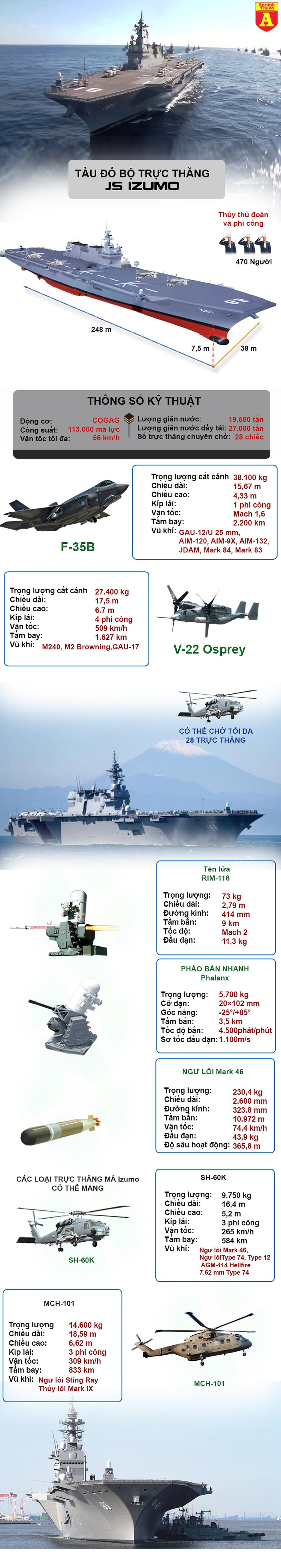 Giới chức Tokyo tiết lộ, tàu Izumo có thể mang các trực thăng tác chiến chống ngầm SH-60K Seahawk và trực thăng MCH-101 rà phá thủy lôi cải tiến. Izumo còn được thiết kế để trong trường hợp cần huy động sẽ mang theo tối đa 14 trực thăng (7 chiếc SH-60K và 7 chiếc MCH-101). 5 chiếc trong số này có thể cất và hạ cánh đồng thời, nhờ Izumo có boong tàu lớn và 5 điểm hạ cánh.