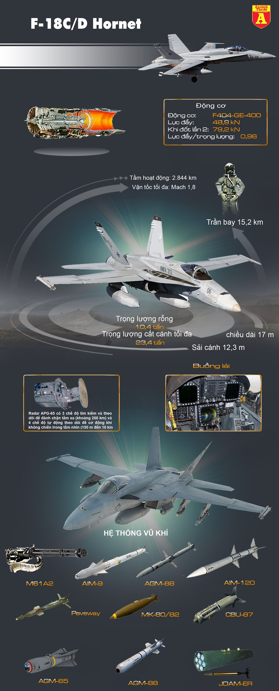 F/A-18 Hornet là một máy bay phản lực chiến đấu đa nhiệm siêu thanh hai động cơ được thiết kế để có thể hoạt động trên tàu sân bay Mỹ. Đây là một trong số những tiêm kích hạm tốt nhất thế giới nhờ khả năng cơ động cao, hệ thống điện tử tiên tiến cùng khả năng hoạt động ổn định. Năng lực chiến đấu của F/A-18 Hornet thậm chí vượt trội so với tiêm kích hạm MiG-29K mới được biên chế gần đây của không quân hải quân Nga.