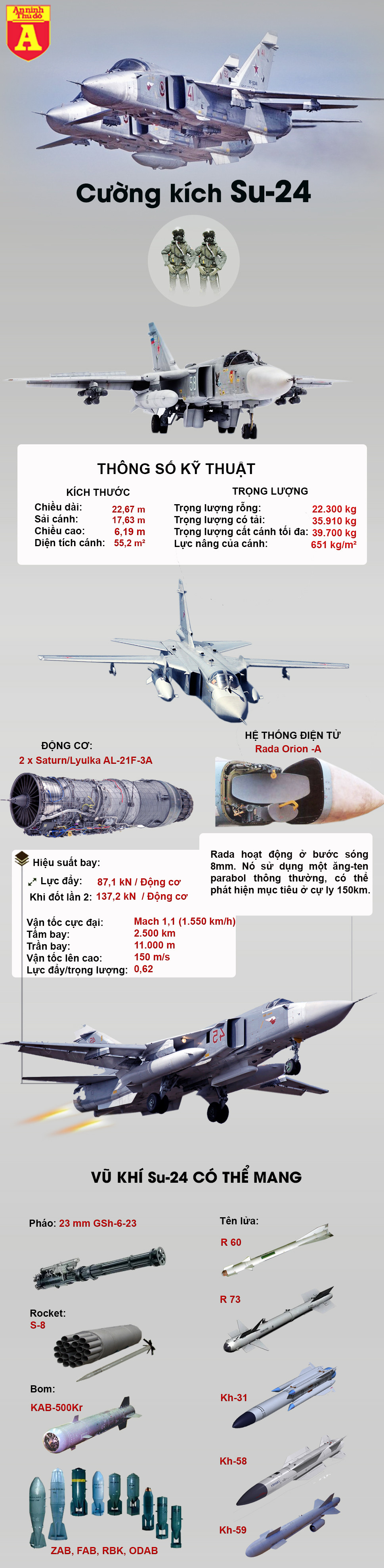 Buồng lái Su-24 có hai chỗ ngồi, một cho phi công và một cho sĩ quan kiểm soát hỏa lực. Chiếc máy bay ném bom này có thể bay với vận tốc tối đa 1.550 km/h, mang theo tới 8 tấn vũ khí tấn công mặt đất như bom thông thường, bom laser KAB-500, các loại tên lửa không đối đất và khẩu pháo GSh-6-23 có cơ số đạn 500 viên.