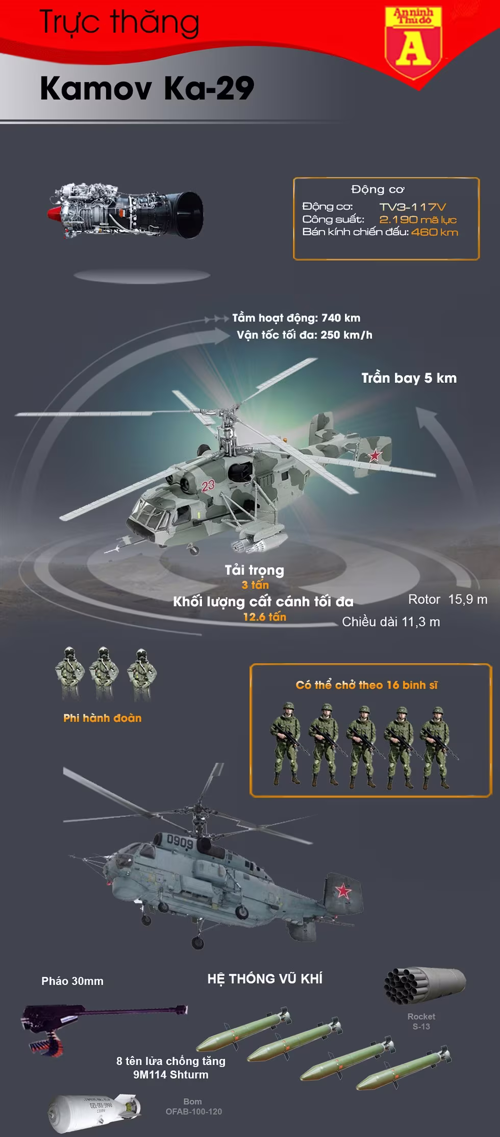 So với dòng trực thăng Ka-27, Ka-29 được thiết kế khung thân mở rộng cho phép chở được tối đa 16 binh sĩ, ngoài ra nó cũng được hàn thêm các giá đỡ bên ngoài để đeo thêm vũ khí khi tấn công mặt đất. Ngoài nhiệm vụ tấn công, Ka-29 còn có khả năng vận chuyển binh sĩ và trinh sát. Cùng xem thông số chi tiết loại trực thăng đặc biệt này qua infographic dưới đây.
