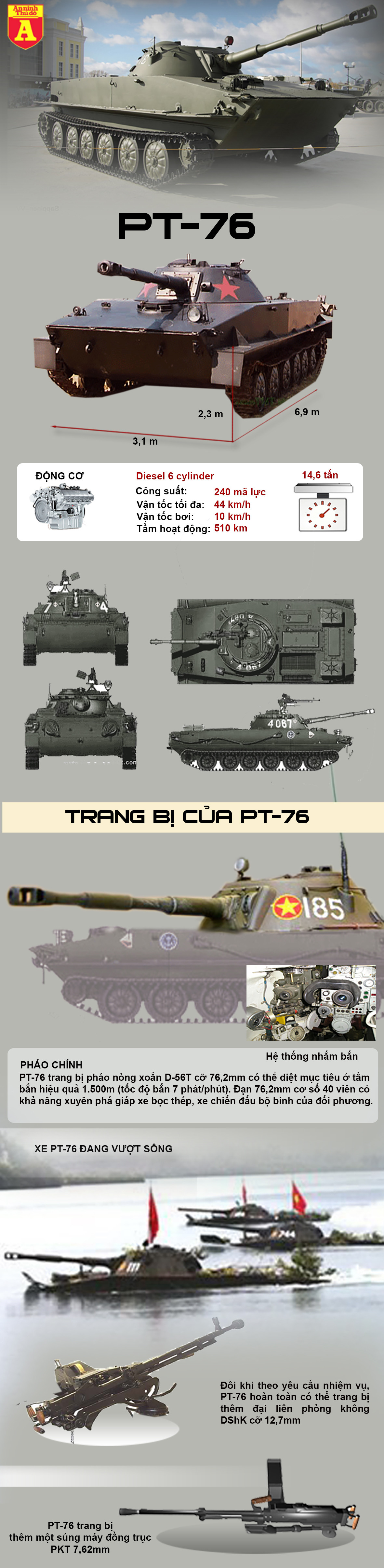 Với trọng lượng chỉ 14 tấn, những chiếc PT-76 có thể xuất hiện và tấn công bất ngờ vào cứ điểm của địch ở những nơi mà xe tăng truyền thống không thể tới. Bên cạnh đó, PT-76 còn sở hữu pháo chính 76,2mm, súng máy 7,62mm và cũng có thể lắp thêm súng máy hạng nặng cỡ nòng 12,7mm khi cần.