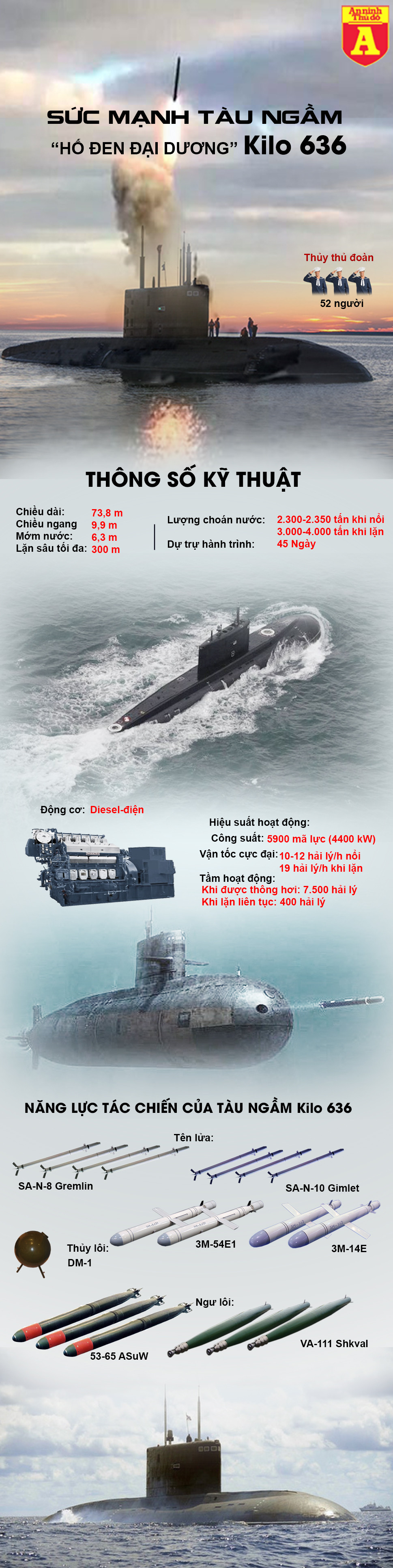 Tàu ngầm Kilo 636 của Nga vốn được mệnh danh là "Hố đen đại dương" bởi hoạt động cực êm. Những cải tiến mới bao gồm việc tăng cường công nghệ tàng hình tiên tiến, phạm vi chiến đấu, khả năng tấn công các mục tiêu trên bộ, trên mặt nước và mục tiêu ngầm được mở rộng, biến Kilo 636 là một trong những tàu ngầm phi hạt nhân mạnh nhất trên thế giới.