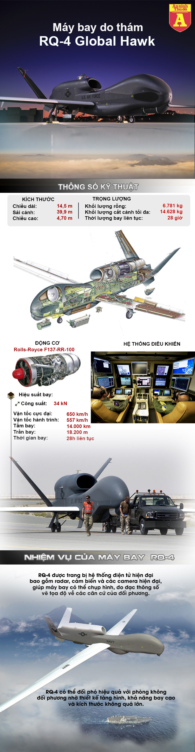 So với máy bay U-2, máy bay do thám RQ-4 Global Hawk không cần người điều khiển trực tiếp, nó có thể lửng lơ trên bầu trời của đối phương hàng ngày liền trước khi phải trở về căn cứ để tiếp nhiên liệu. Một chiếc Global Hawk có khả năng giám sát khu vực có diện tích lên tới 103.600 km2 trong một ngày.