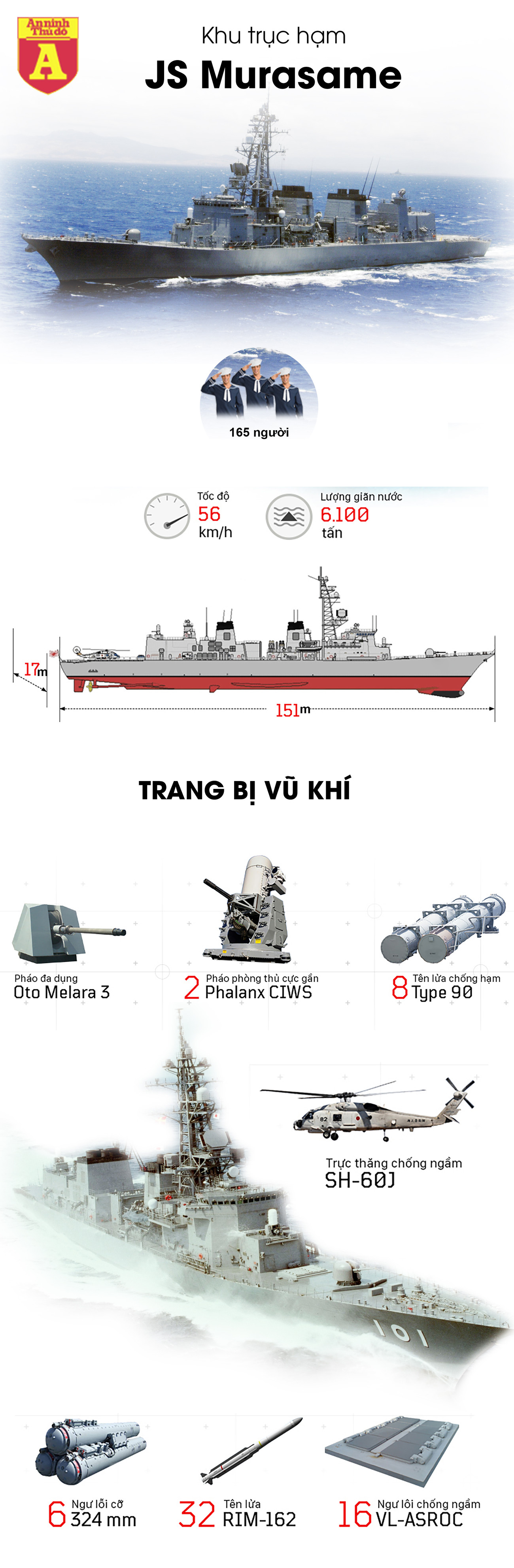 Tàu khu trục đa dụng JS Murasame vừa cập cảng Cam Ranh, tỉnh Khánh Hòa, bắt đầu chuyến thăm Việt Nam từ ngày 14 đến 17-6. Đây là một phần trong đợt huấn luyện dài ba tháng tại Biển Đông và Ấn Độ Dương của nhóm chiến hạm Nhật Bản. Ngoài Việt Nam, các tàu chiến cũng cập cảng, thăm một số quốc gia Đông Nam Á như Singapore, Philippines và Brunei. Cùng với khu trục hạm này còn có tàu đổ bộ trực thăng JS Izumo.