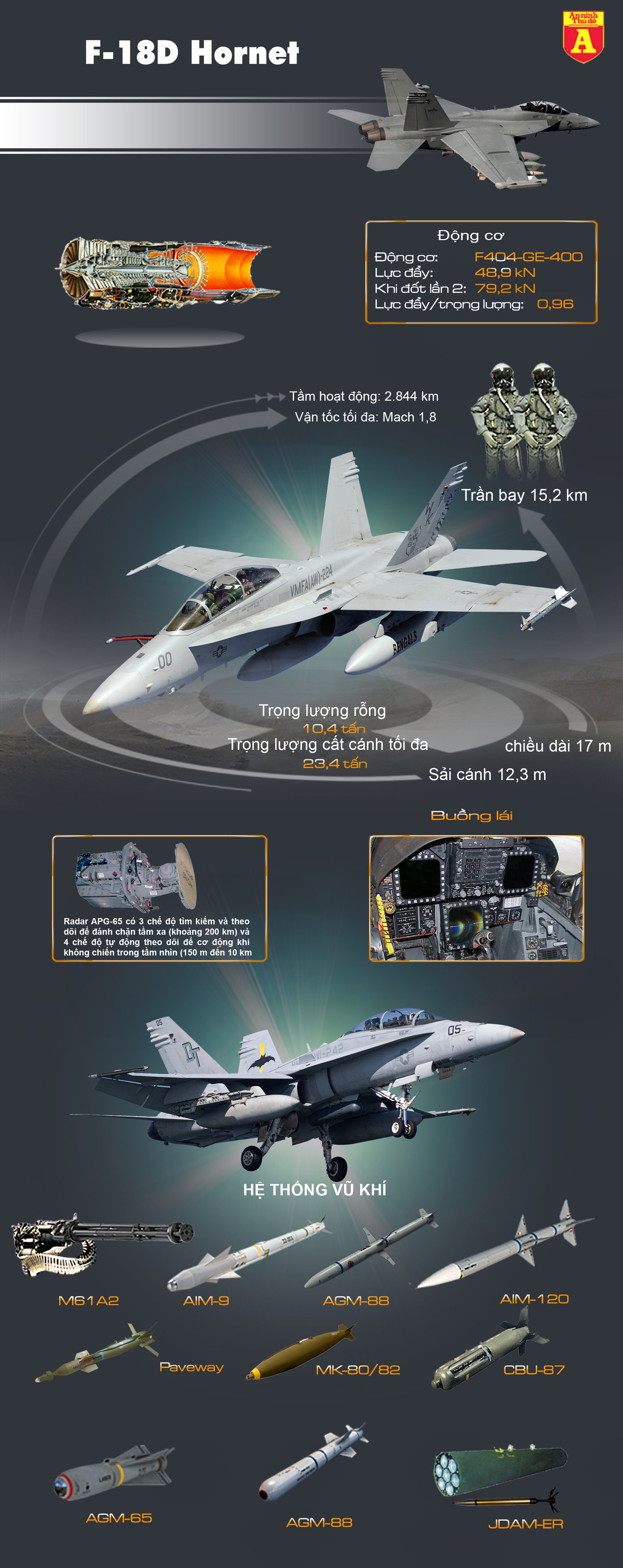 F/A-18 Hornet được sử dụng trong lực lượng không quân của nhiều quốc gia. Đây là loại máy bay trình diễn của phi đội trình diễn bay Hải quân Hoa Kỳ, Blue Angels, từ năm 1986. F/A-18 có tốc độ tối đa Mach 1,8. Nó có thể mang nhiều loại bom và tên lửa, gồm cả tên lửa không đối không và không đối đất cùng một pháo M61 Vulcan 20 mm. Máy bay sử dụng hai động cơ turbin cánh quạt General Electric F404 giúp nó có một tỷ lệ lực đẩy trên trọng lượng cao.