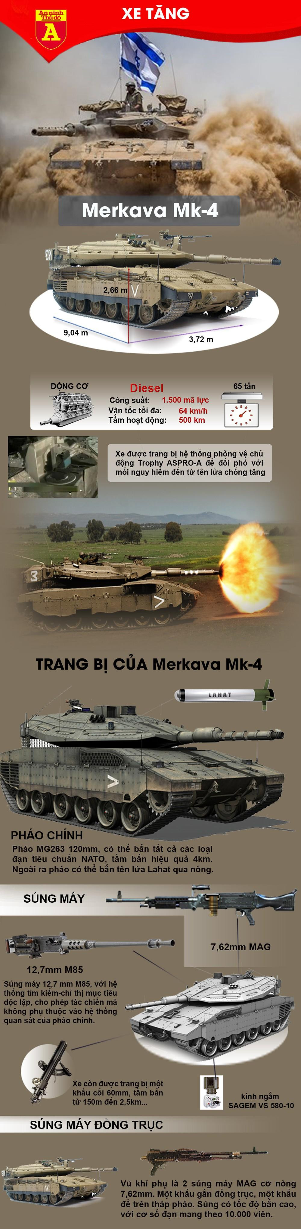 Merkava Mk-4 là biến thể mạnh nhất và mới nhất trong gia đình tăng Merkava Mk nổi tiếng. Những chiếc tăng Merkava IV được trang bị pháo 120mm, bắn được tất cả các loại đạn của NATO trong đó có đạn xuyên thoát vỏ có cánh ổn định APFSDS, đạn nổ lõm chống tăng đa năng HEAT-MP, pháo tăng còn có thể phóng tên lửa chống tăng nổi tiếng LAHAT qua nòng.