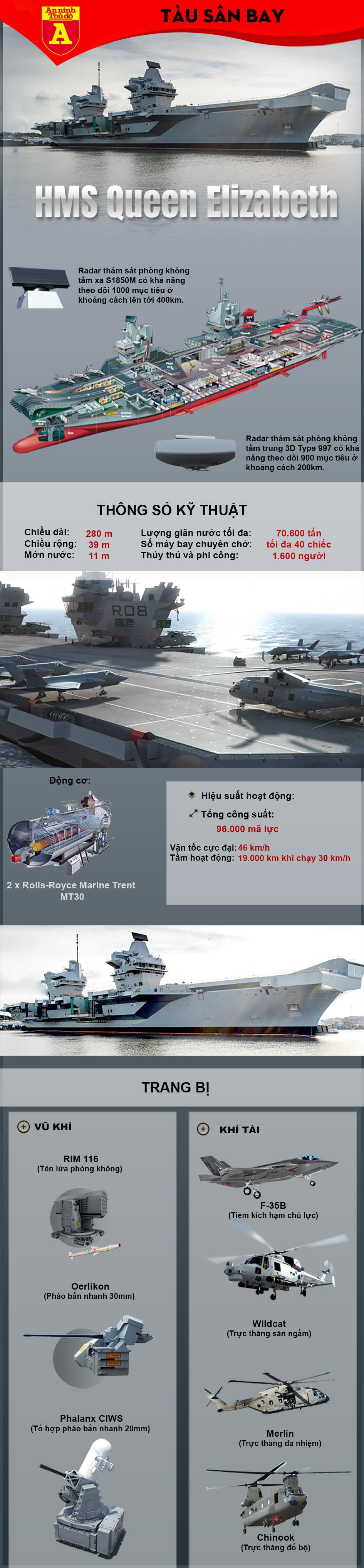 So về mặt kích thước, trang bị điện tử và vũ khí tàu sân bay lớp Queen Elizabeth của Anh cũng vượt trội so với các tàu sân bay Đô đốc Kuznetsov của Nga và tàu Liêu Ninh của Trung Quốc. Tàu sân bay này cũng được thiết kế tối ưu độ bộc lộ tín hiệu radar và được áp dụng những công nghệ hàng hải tối tân nhất trên thế giới do Thales và BAE Systems phát triển. Cùng với việc sử dụng loại tiêm kích tàng hình thế hệ thứ 5 F-35B khiến cho sức mạnh của tàu thực sự là mối lo ngại lớn cho các đối thủ của Hải quân Hoàng gia Anh.