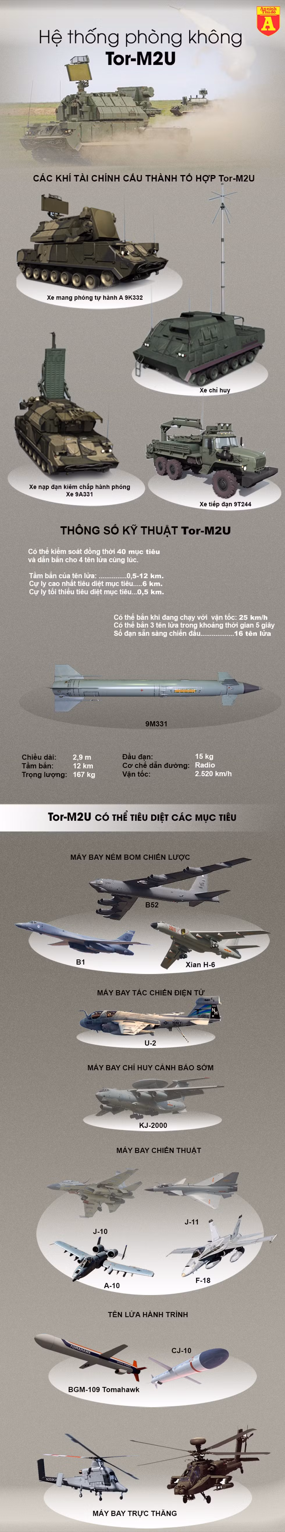 Tor-M2U là tổ hợp tên lửa phòng không tầm ngắn hiện đại hóa từ loại Tor-M2. Hệ thống này được thiết kế để bảo vệ các căn cứ quân sự, cơ sở chính phủ trước các cuộc không kích. Đạn tên lửa có khả năng phá hủy hầu như mọi mục tiêu bao gồm tên lửa hành trình, tên lửa có điều khiển, các loại máy bay, bom thông minh, vũ khí chính xác cao ở độ cao thấp - trung. Hệ thống tên lửa phòng không Tor-M2U bao gồm nhiều thành phần: X chiến đấu 9A331; xe tiếp đạn 9T244; xe cẩu 9T245; xe bảo trì 9V887; xe tải 9F399 và một số thành phần khác.