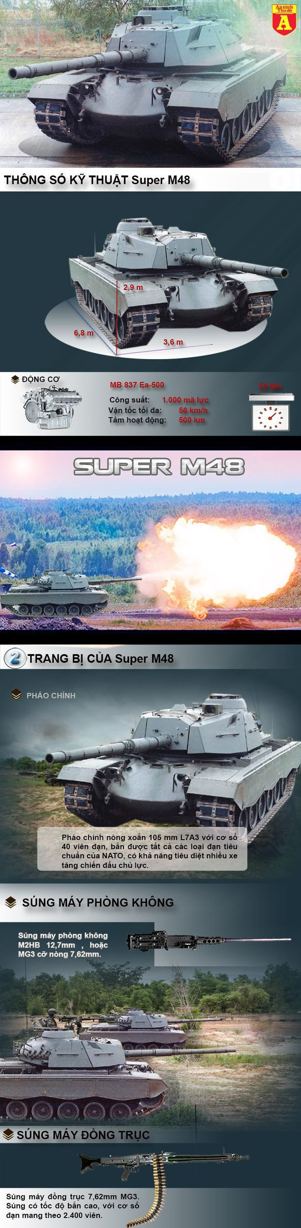 Ngoài ra, Super M48 trang bị súng máy phòng không 12,7mm và thay thế súng máy đồng trục bằng loại MG3 do Đức chế tạo, cùng khối động cơ có công suất lên tới 1.000 mã lực, với hộp số tự động gồm 4 số tiến và 4 số lùi, hệ thống treo cũng được thay thế mới, sử dụng 3 con lăn thay vì 5 con như trước đây.
