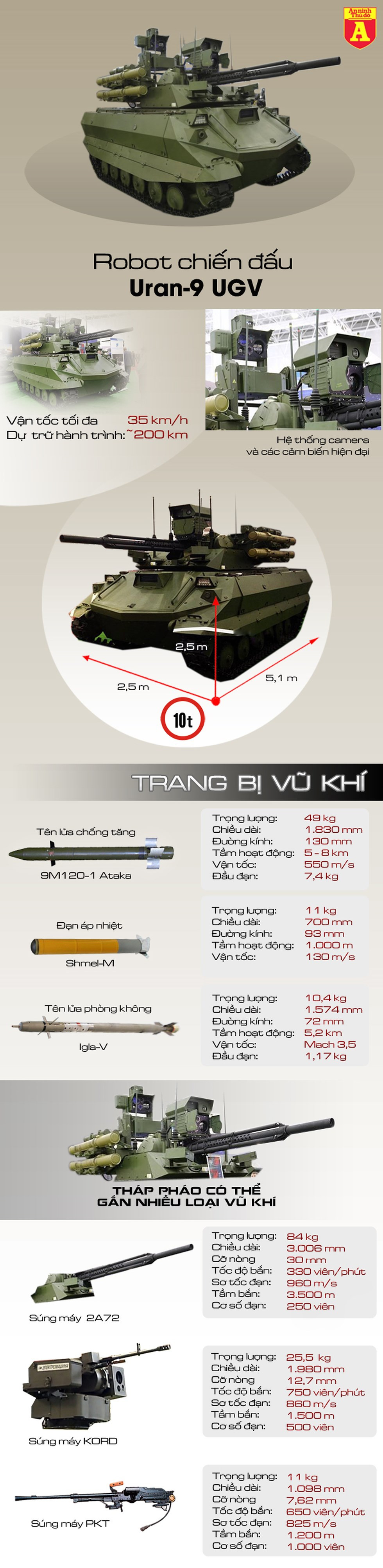 Robot quân sự Uran-9 có khối lượng nặng 10 tấn, được trang bị súng phóng lựu nhiệt áp Shmel-M, tên lửa chống tăng có điều khiển Ataka, pháo tự động 30mm và súng máy 7,62mm. Robot có thể chuyển động với tốc độ khoảng 35 km/h. Dự trữ hành trình là 200km.