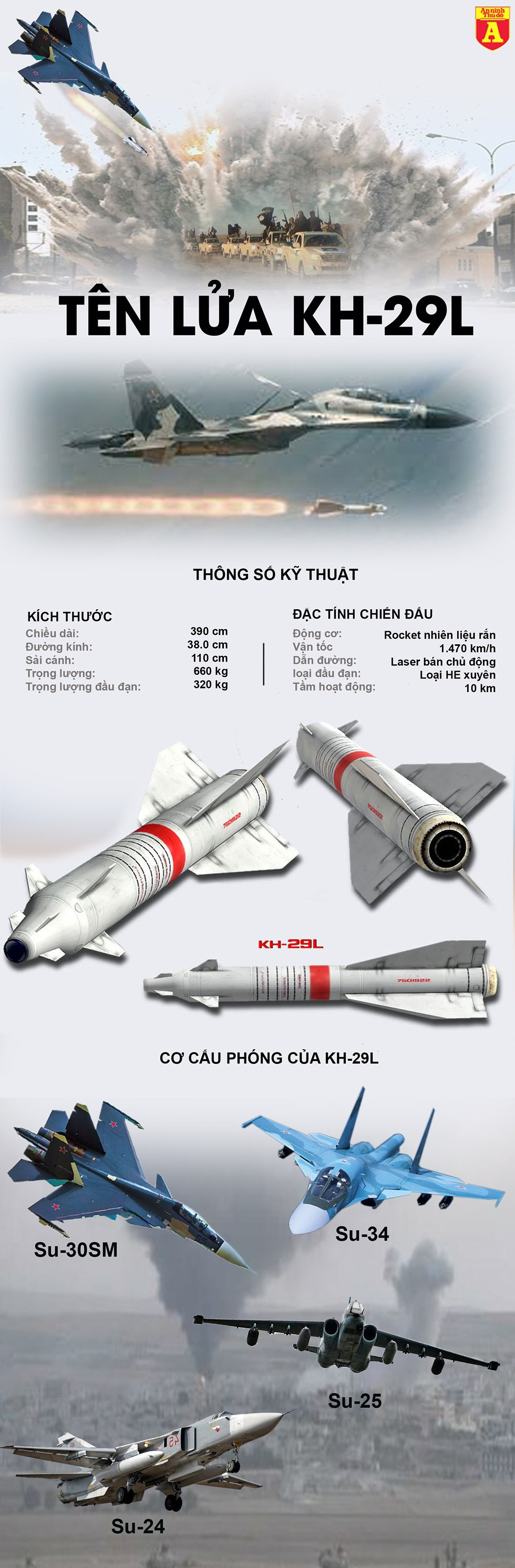 Kh-29 là loại tên lửa siêu âm được bắt đầu sử dụng trong không quân Liên Xô từ những năm 1980, chuyên dùng cho các nhiệm vụ yểm trợ hỏa lực trên bộ, trên biển, công kích các mục tiêu kiên cố, các loại tàu chiến đấu, tàu đổ bộ, tàu hậu cần chỉ huy với chức năng tương tự loại tên lửa AGM-65 Maverick của Mỹ và AS-30 của Pháp. Tên lửa Kh-29 với đầu đạn nặng 320 kg đủ sức đánh chìm một chiến hạm có lượng giãn nước lên tới 10.000 tấn.