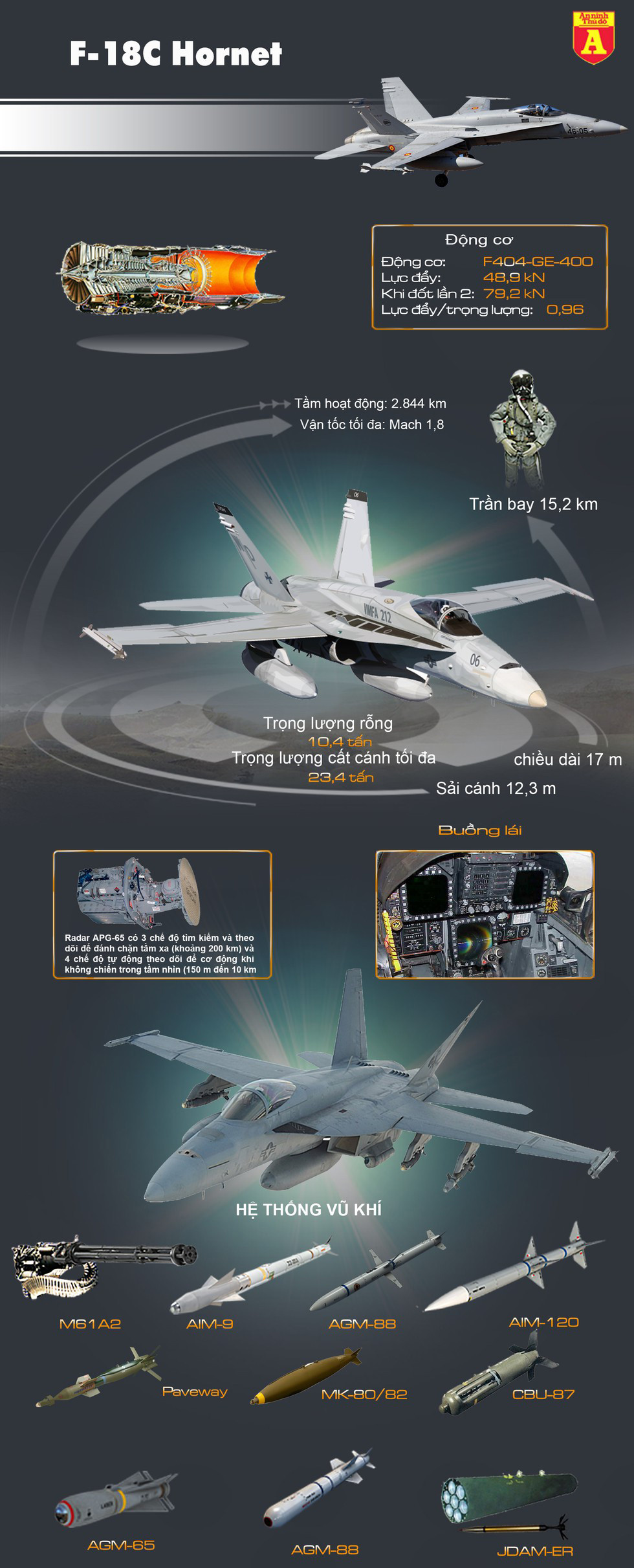 F/A-18 Hornet cũng được sử dụng trong lực lượng không quân của nhiều quốc gia. Đây là loại máy bay trình diễn của Phi đội Trình diễn Bay của Hải quân Hoa Kỳ, Blue Angels, từ năm 1986. F/A-18 có tốc độ tối đa Mach 1,8. Nó có thể mang nhiều loại bom và tên lửa, gồm cả tên lửa không đối không và không đối đất cùng một pháo M61 Vulcan 20 mm. Máy bay sử dụng hai động cơ turbin cánh quạt General Electric F404 giúp nó có một tỷ lệ lực đẩy trên trọng lượng cao.