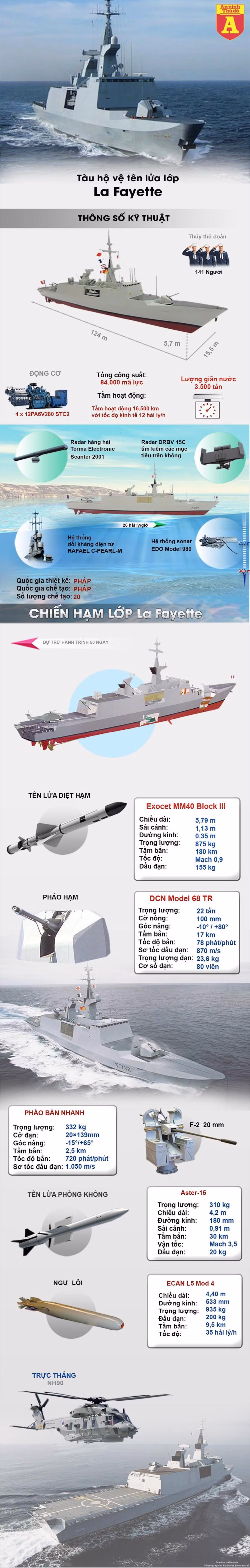La Fayette thuộc loại tàu hộ tống tàng hình đa năng do tập đoàn DCNS thiết kế và đưa vào phục vụ hải quân Pháp từ năm 1996. Lớp La Fayette nổi bật với thiết kế tàng hình độc nhất vào thời điểm nó ra đời. Giảm tiết diện phản xạ sóng radar được tạo nên nhờ cấu trúc thượng tầng góc cạnh, mặt phẳng lì và sử dụng nhiều vật liệu hấp thụ sóng radar, vật liệu composite bằng gỗ và sợi thủy tinh cứng như thép nhưng nhẹ và chống cháy.