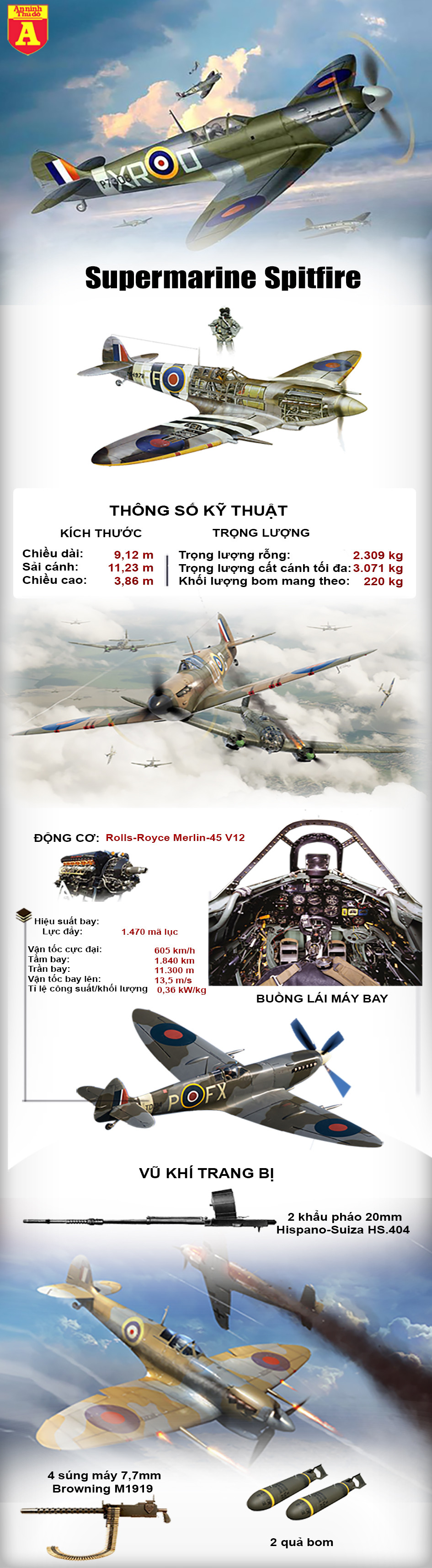Sức mạnh nổi bật của các tiêm kích Supermarine Spitfire là hình dáng khí động học giúp máy bay có khả năng cơ động tuyệt vời, tầm hoạt động xa, khá dễ điều khiển và hỏa lực mạnh. Các phiên bản đầu mang súng máy cỡ nòng 7,7mm, những biến thể về sau trang bị pháo 20mm cho hỏa lực mạnh mẽ hơn. Sau chiến Thế chiến thứ 2, những chiếc Supermarine Spitfire tiếp tục xuất hiện trong cuộc chiến tại Trung Đông- Bắc Phi và tiếp tục bay cho đến những năm 1960 mới chính thức nghỉ hưu hoàn toàn.